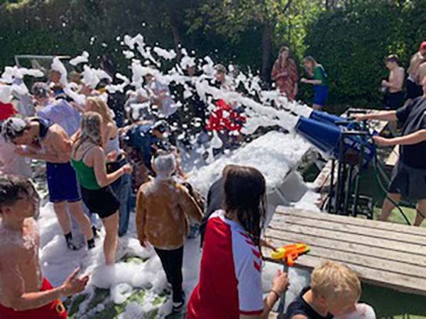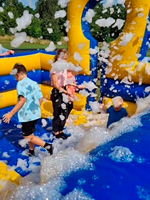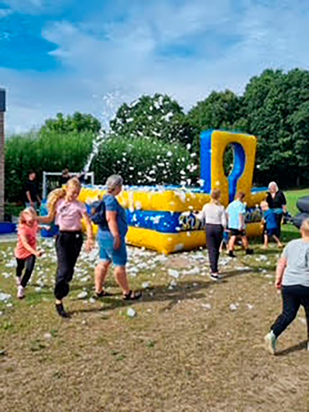 Vi bruger en skånsom skumvæske, der ikke skader græsset eller naturen. Det betyder, at du kan bruge vores skumkanon direkte på plænen uden bekymringer. Hvis du derimod afholder arrangementet på asfalt, fliser eller indendørs, anbefaler vi brug af vores skumbane, som skaber det perfekte underlag til skumleg – uden at gå på kompromis med sikkerhed eller komfort.